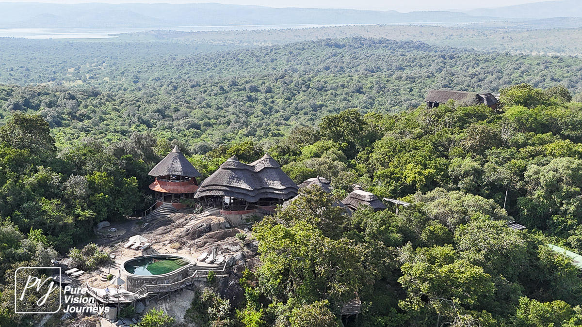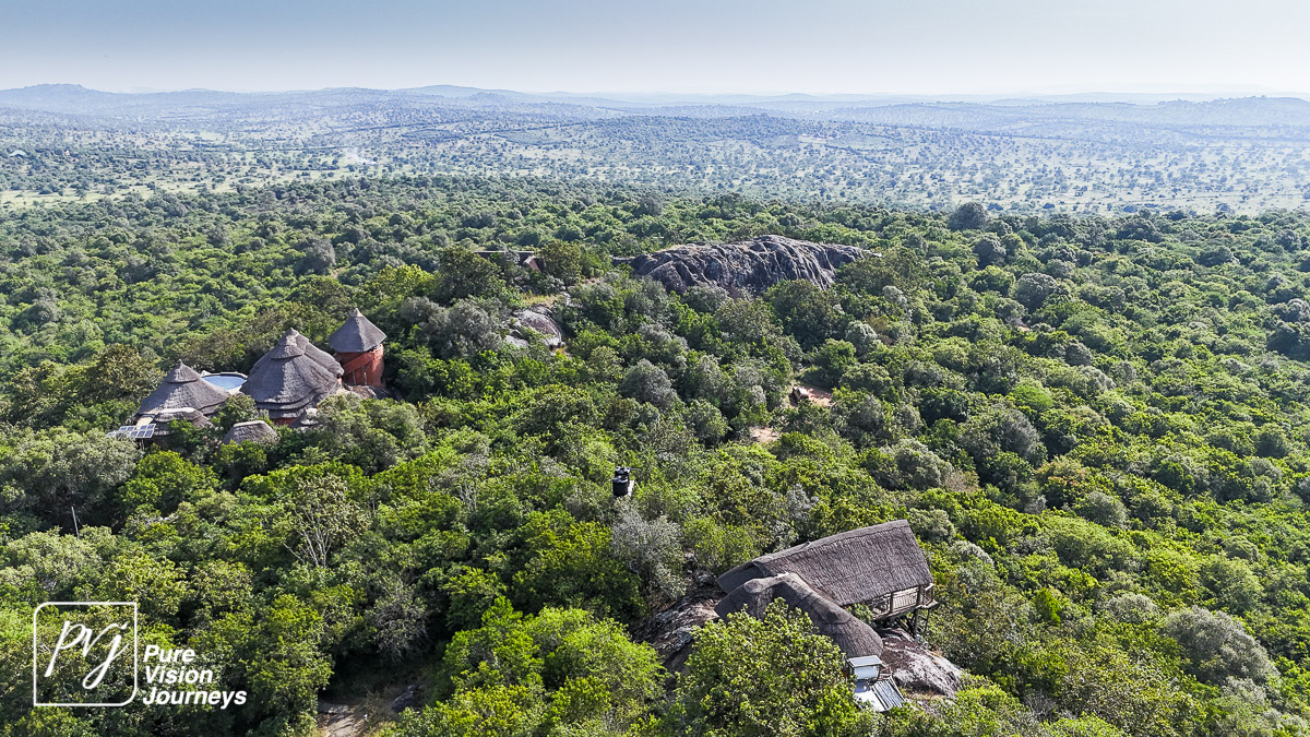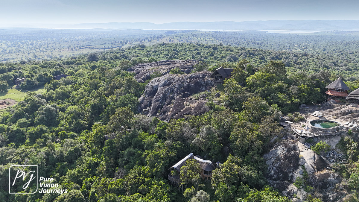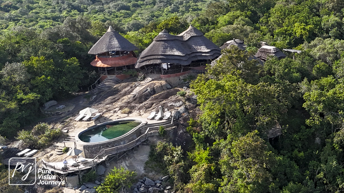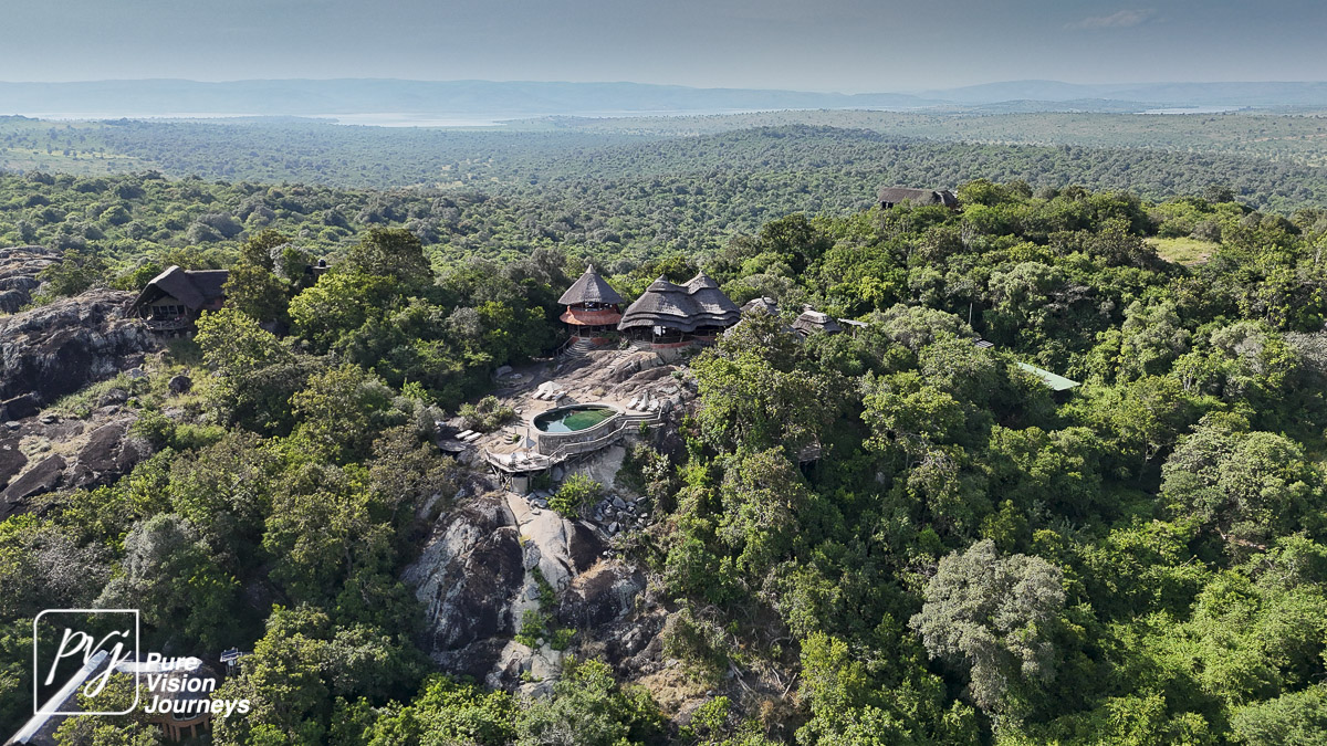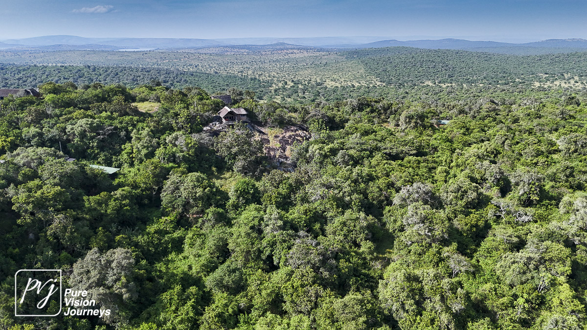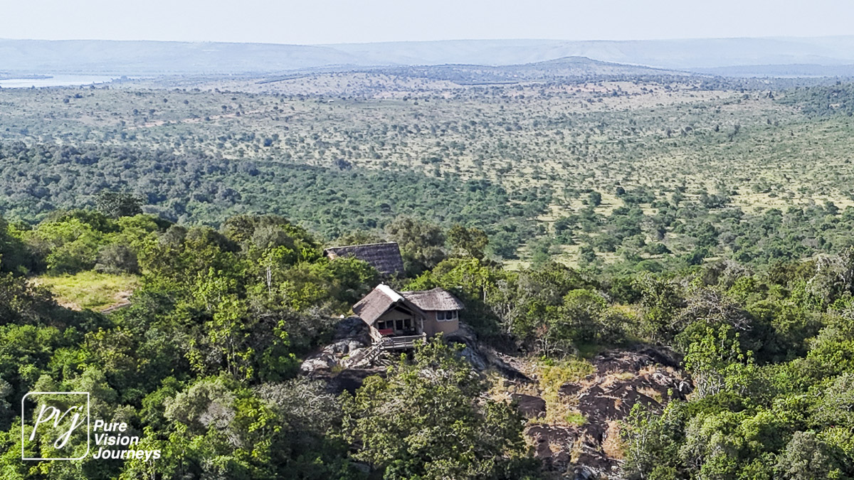 This photo gallery showcases an aerial view of Mihingo Lodge.